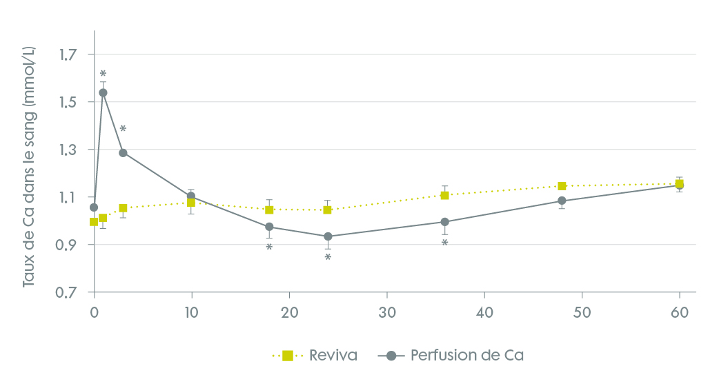 Figure 2. Taux de Ca dans le sang avec l’utilisation de Reviva ou d’un bolus de Ca. Un taux sanguin de Ca <2,0 mmol/L indique une fièvre de lait subclinique.