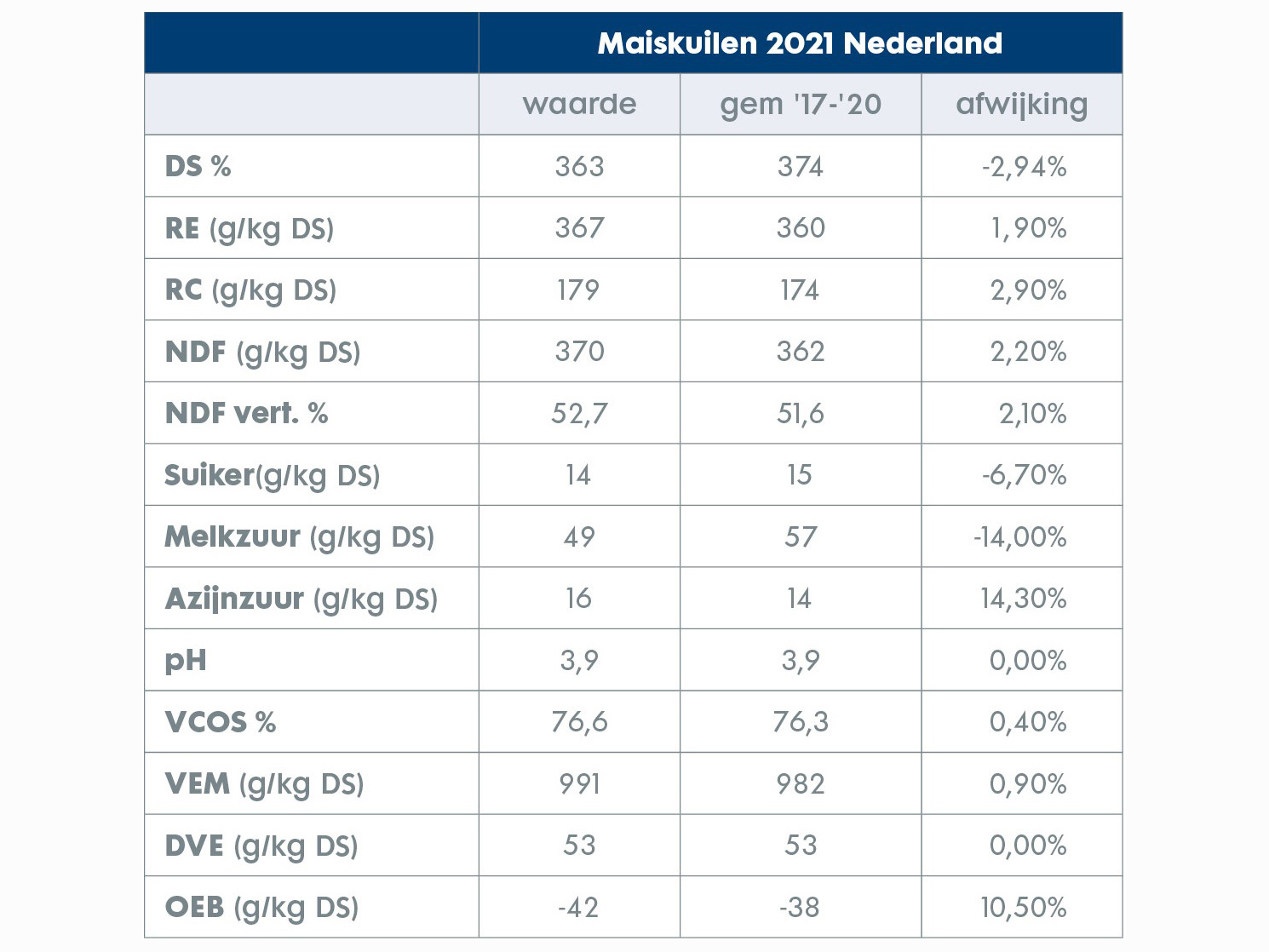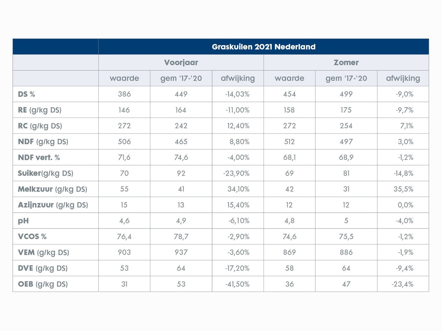 Vanwege het natte en koude voorjaar is er vaak wat later in het seizoen gemaaid. Dit is terug te zien in het feit dat de graskuilen op sommige parameters sterk afwijken in vergelijking met de voorgaande 4 jaar (2017-2020).