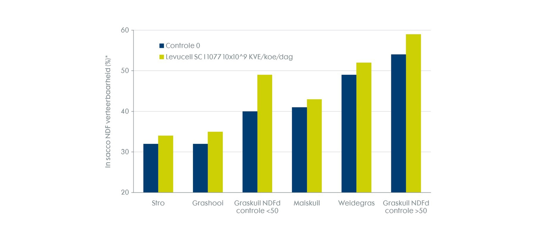 Het is aangetoond dat Levucell SC zorgt voor een betere NDF-vertering (NDFd). Voor individuele ruwvoeders wordt met name bij graskuilen en moeilijk verteerbare maiskuilen een betere NDFd waargenomen (figuur 1). Dit resulteert in een grotere microbiële biomassa en dus meer microbieel eiwit en een hogere DVE-productie met hetzelfde rantsoen.