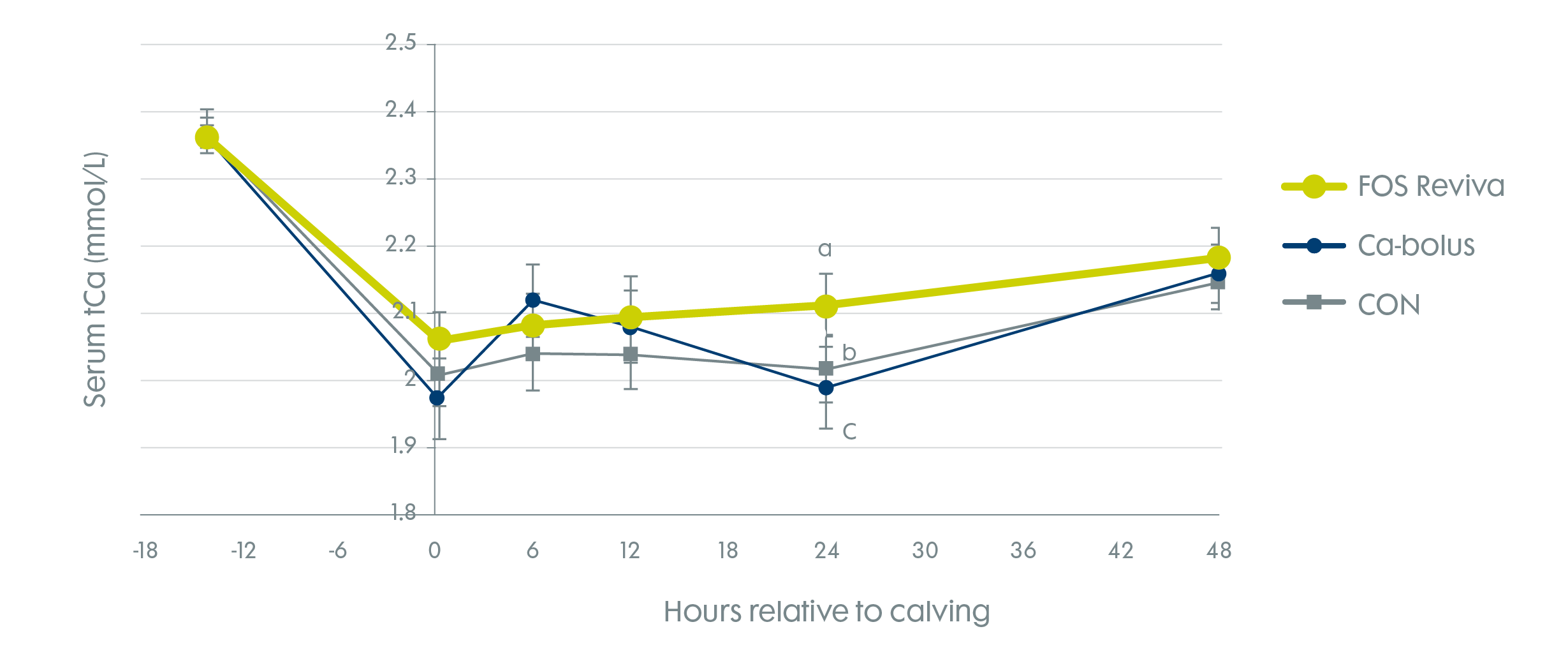 Deze grafiek vergelijkt het gebruik van een calciumbolus (Ca-Bolus), Farm-O-San Reviva en een controlegroep (CON) na de geboorte. Bij de bolus is duidelijk te zien dat het calciumgehalte in het bloed het snelst stijgt, maar ook na 24 uur tot het laagste niveau daalt. Dit betekent dat, hoewel de bolus zeer snel werkt, de koeien na 24 uur weer in een "calciumdip" terechtkomen. Met Farm-O-San Reviva neemt het calciumgehalte gelijkmatig toe en bereikt het na 24 uur het hoogste calciumgehalte, dat 48 uur na de geboorte op het hoogste niveau blijft.