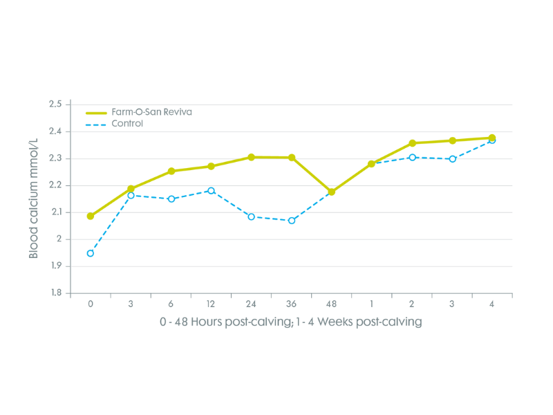 Farm-O-San Reviva is een licht verteerbare, zeer smakelijke energiedrank voor koeien. Het bevat de elektrolyten, calcium en energie die de koe nodig heeft om te herstellen na het afkalven, in een snel beschikbare formule. Het moet onmiddellijk na het afkalven worden gegeven. Deze energiebooster stimuleert de activiteit van de koe, de drogestofopname en verhoogt het calciumgehalte in het bloed na het afkalven, wat duidelijk zichtbaar is in deze grafiek. Dit draagt bij aan een goede start van de melkproductie en verbetert de gezondheid.